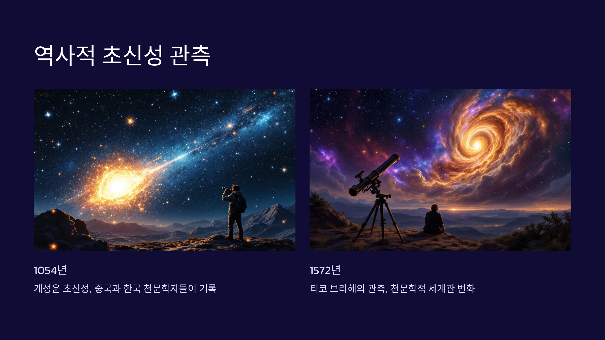 인류는 오래전부터 초신성 폭발을 관측하고 기록해 왔습니다. 1054년에 일어난 게성운 초신성은 중국과 한국의 고대 천문학자들이 세밀하게 기록한 대표적인 사례로, 이 초신성은 낮에도 보일 만큼 강한 빛을 내며 약 23일 동안 밤하늘을 밝힌 것으로 전해집니다. 또한, 1572년 덴마크의 천문학자 티코 브라헤가 관측한 초신성은 당시 천문학적 세계관에 큰 변화를 일으켰으며, "하늘은 불변한다"는 아리스토텔레스의 우주관을 뒤집는 중요한 계기가 되었습니다.